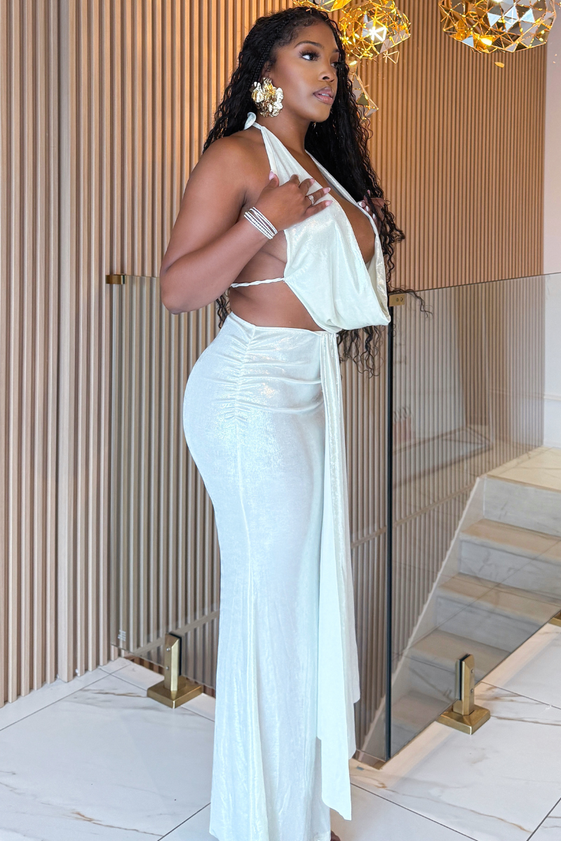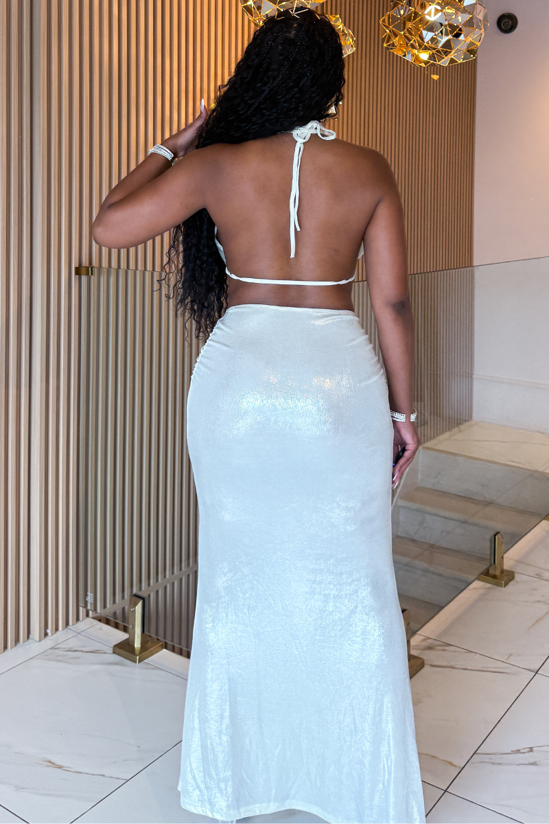Drape yourself in drama with the Glow Hour Set— a soft halter skirt set that demands attention. Featuring a deep plunge neckline, peekaboo waist strap, and a flowing tie-front detail, this set is built for moonlit nights, all-white parties, or luxe resort dinners.