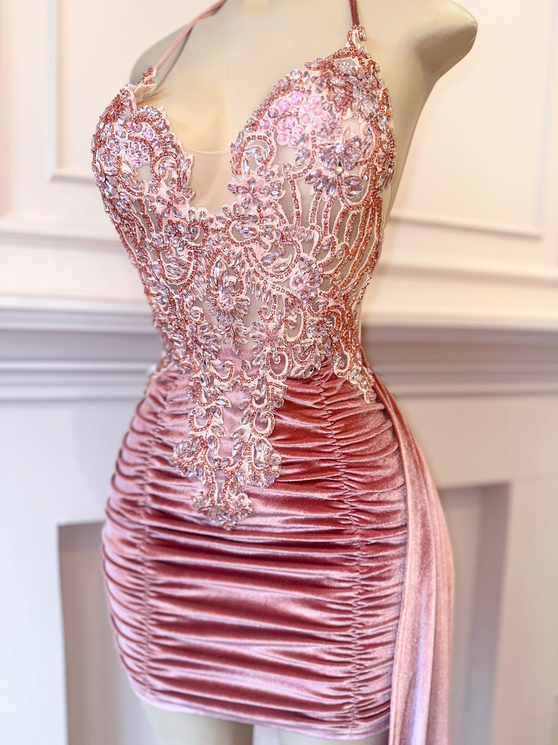 Step into pure sophistication with the Nina Blush Velvet Dress, a stunning handcrafted gown designed for women who love to make a statement. Featuring luxurious ruched velvet in a rich blush pink hue, this dress is the epitome of high-fashion elegance. The deep V-neckline and halter design are adorned with hand-sewn rhinestones and intricate beaded appliqués, creating an irresistible sparkle that catches every light.