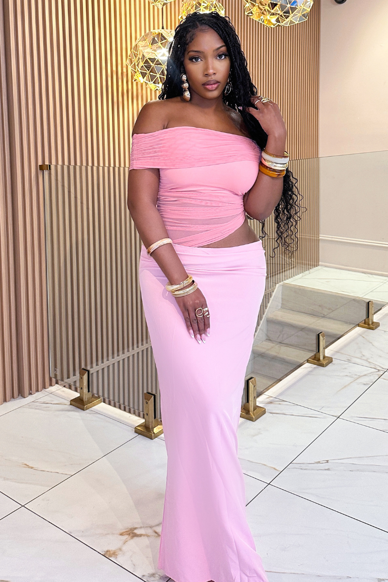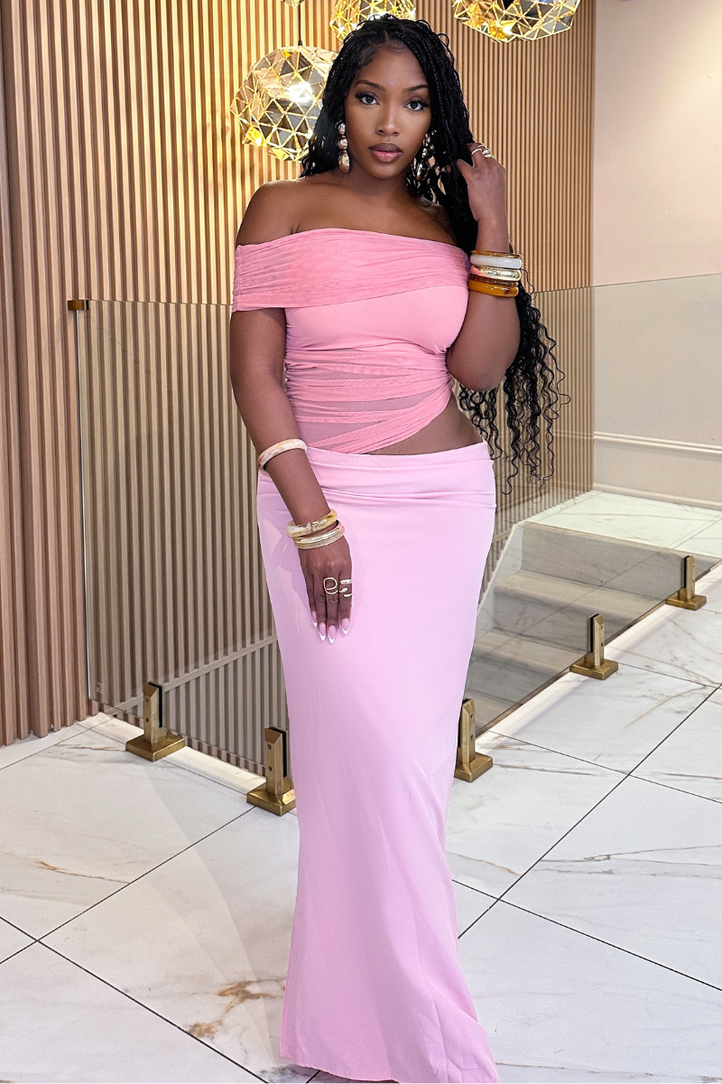 Step into feminine elegance with the Clara Dress, designed to flatter your curves and make you feel your most confident. This soft pink off-the-shoulder dress features gathered ruching throughout to create a stunning hourglass silhouette while remaining comfortable and easy to wear.